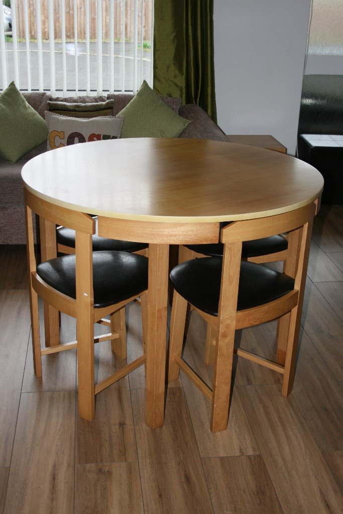 The comfy upholstered chairs have a wipe clean finish ideal for family dining and they tuck .